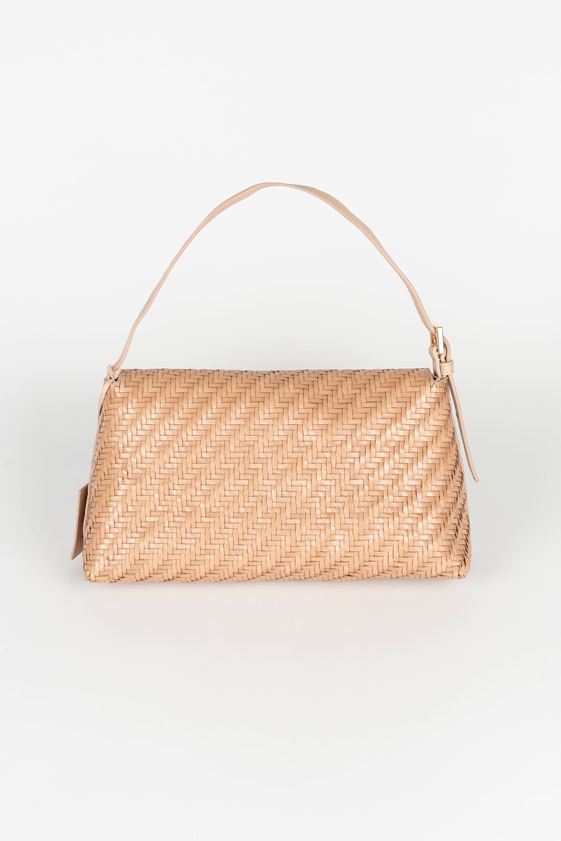 Este bolso compacto presenta una silueta rectangular definida con solapa frontal que estructura el diseño y aporta equilibrio visual. La superficie está completamente trabajada en trenzado fino en patrón espiga, creando una textura uniforme y elegante que añade profundidad. Incorpora asa corta ajustable con herraje metálico en tono dorado, manteniendo una estética limpia y funcional. Su formato ligero lo convierte en una opción práctica para llevar lo esencial con comodidad.
