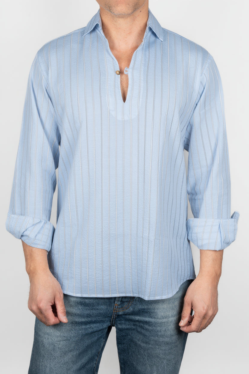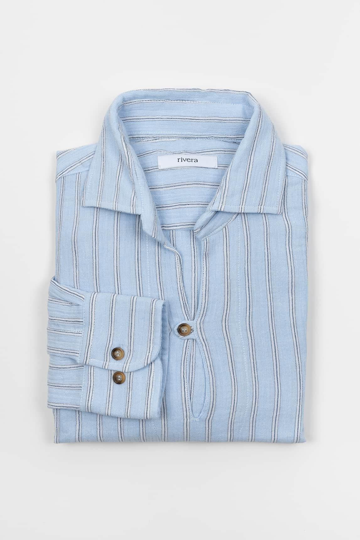 Camisa de hombre de manga larga en tono azul cielo, con silueta recta y acabado ligeramente arrugado que aporta textura y un aspecto natural. Presenta cuello abierto, tapeta frontal parcial con botones y puño abotonado, manteniendo una imagen desenfadada pero cuidada. La superficie muestra relieve sutil y una construcción visual ligera que refuerza su carácter fresco, mientras la línea limpia del diseño facilita una caída cómoda y favorecedora.