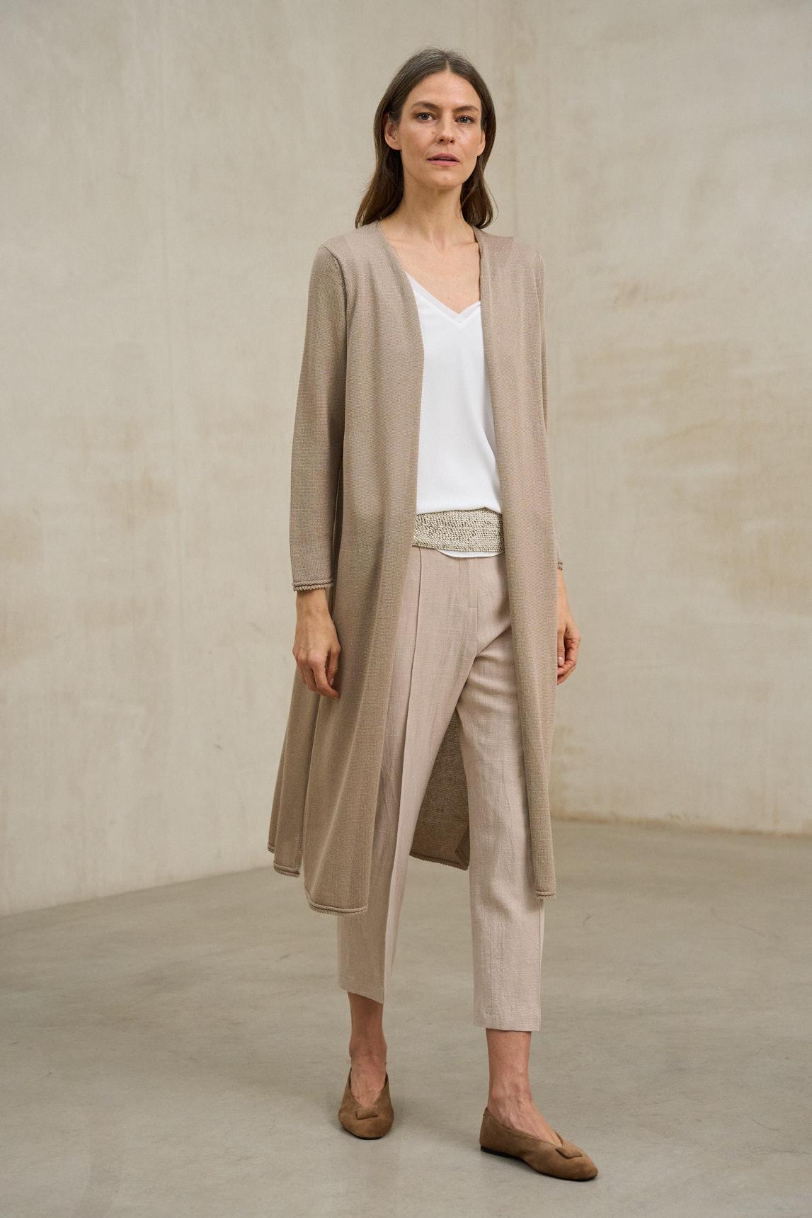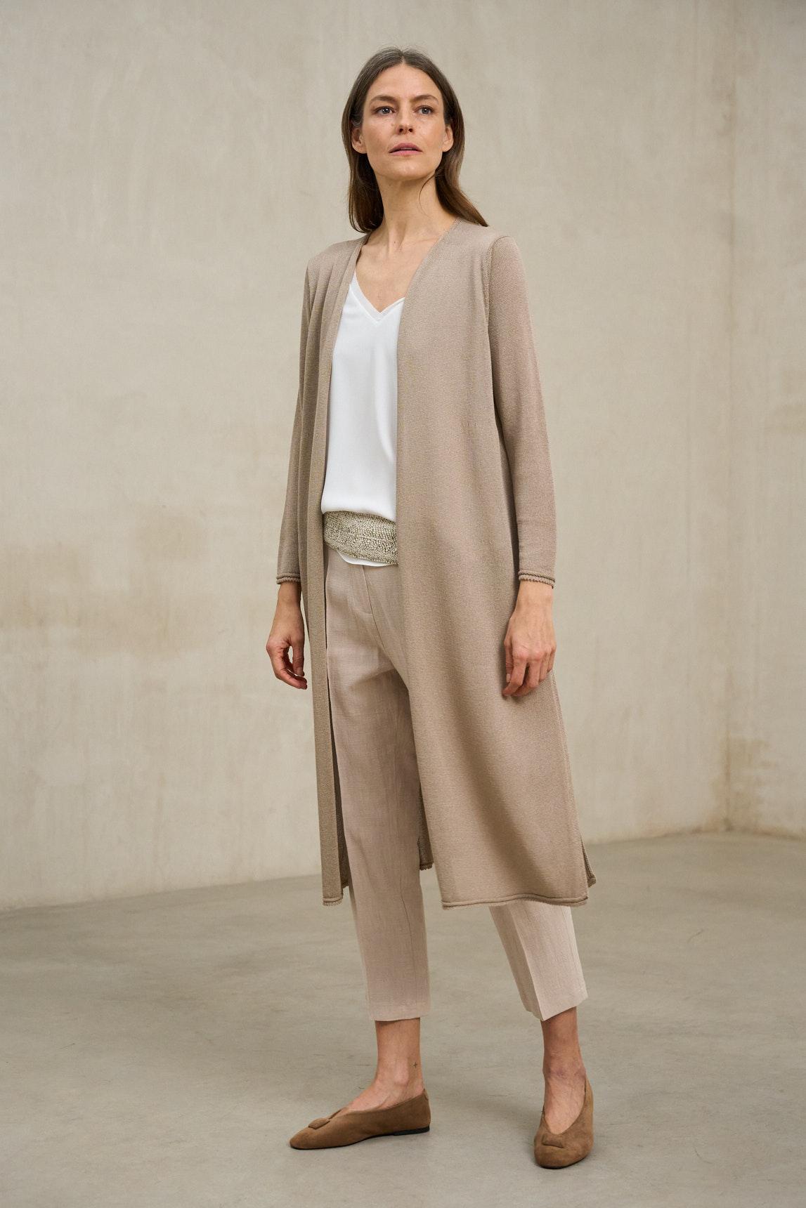 La chaqueta de punto Avelin arena es una prenda larga y fluida diseñada para aportar ligereza y sofisticación a los estilismos de entretiempo. Su silueta abierta, sin cierre, cae con naturalidad desde los hombros, creando una línea vertical que estiliza y alarga la figura. Confeccionada en tejido de punto suave y ligero, presenta manga larga y un bajo ligeramente evasé que aporta movimiento al caminar. El tono arena, neutro y atemporal, facilita múltiples combinaciones y refuerza su carácter versátil dentro de un armario elegante y funcional. Ideal para llevar sobre conjuntos monocromáticos o sobre pantalones fluidos y tops básicos, la chaqueta de punto Avelin arena se adapta tanto a looks de oficina como a propuestas más relajadas. Es una pieza pensada para superponer sin añadir peso, aportando estructura suave y equilibrio al conjunto. Nos esforzamos por mostrar los colores de la forma más fiel posible, pero pueden variar ligeramente respecto a la realidad.