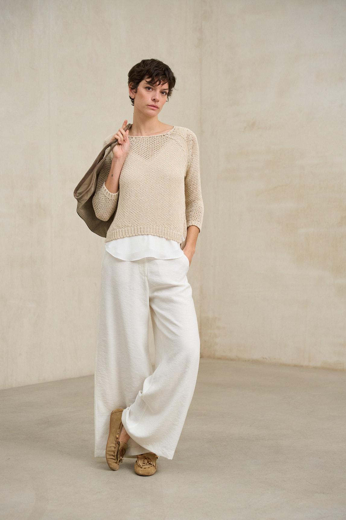 El jersey Évela beige arena combina la ligereza del punto fino con un delicado trabajo calado en la parte superior que aporta textura y profundidad visual. Su tejido es sutilmente translúcido, generando un efecto ligero y etéreo; se recomienda llevarlo con top interior (no incluido), como el top Alenia blanco roto para un acabado natural y equilibrado. Presenta escote amplio y manga tres cuartos, con una estructura suave que acompaña el movimiento sin ceñir. Su silueta relajada lo convierte en una pieza ideal para estilismos en capas y conjuntos de inspiración neutra. El tono beige arena transmite calidez y armonía, combinando especialmente bien con pantalones fluidos en crudo, verde oliva o tonos tierra. Una prenda versátil pensada para un armario sereno y sofisticado. Nos esforzamos por mostrar los colores de la forma más fiel posible, pero pueden variar ligeramente respecto a la realidad.