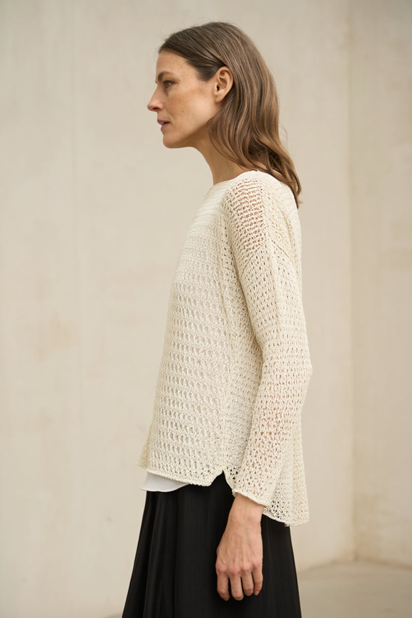 El jersey Lúvena crudo es una prenda ligera confeccionada en punto fino con textura calada en la parte superior, que aporta un sutil juego visual y un acabado delicado. Su tejido es ligeramente translúcido, por lo que se recomienda combinarlo con una camiseta interior o top básico (no incluido). Para un acabado limpio y armónico, recomendamos el top Alenia blanco roto, diseñado como base perfecta para este tipo de prendas caladas. Presenta escote redondo amplio y manga tres cuartos, con una caída suave que favorece la silueta sin ceñir. Su estructura liviana lo convierte en una opción ideal para entretiempo o para superponer sobre prendas ligeras. El tono crudo aporta luminosidad natural y una elegancia serena, integrándose con facilidad en estilismos neutros junto a arena, topo, camel o tonos tierra. Una pieza versátil que equilibra sencillez y textura con un aire refinado y contemporáneo. Nos esforzamos por mostrar los colores de la forma más fiel posible, pero pueden variar ligeramente respecto a la realidad.