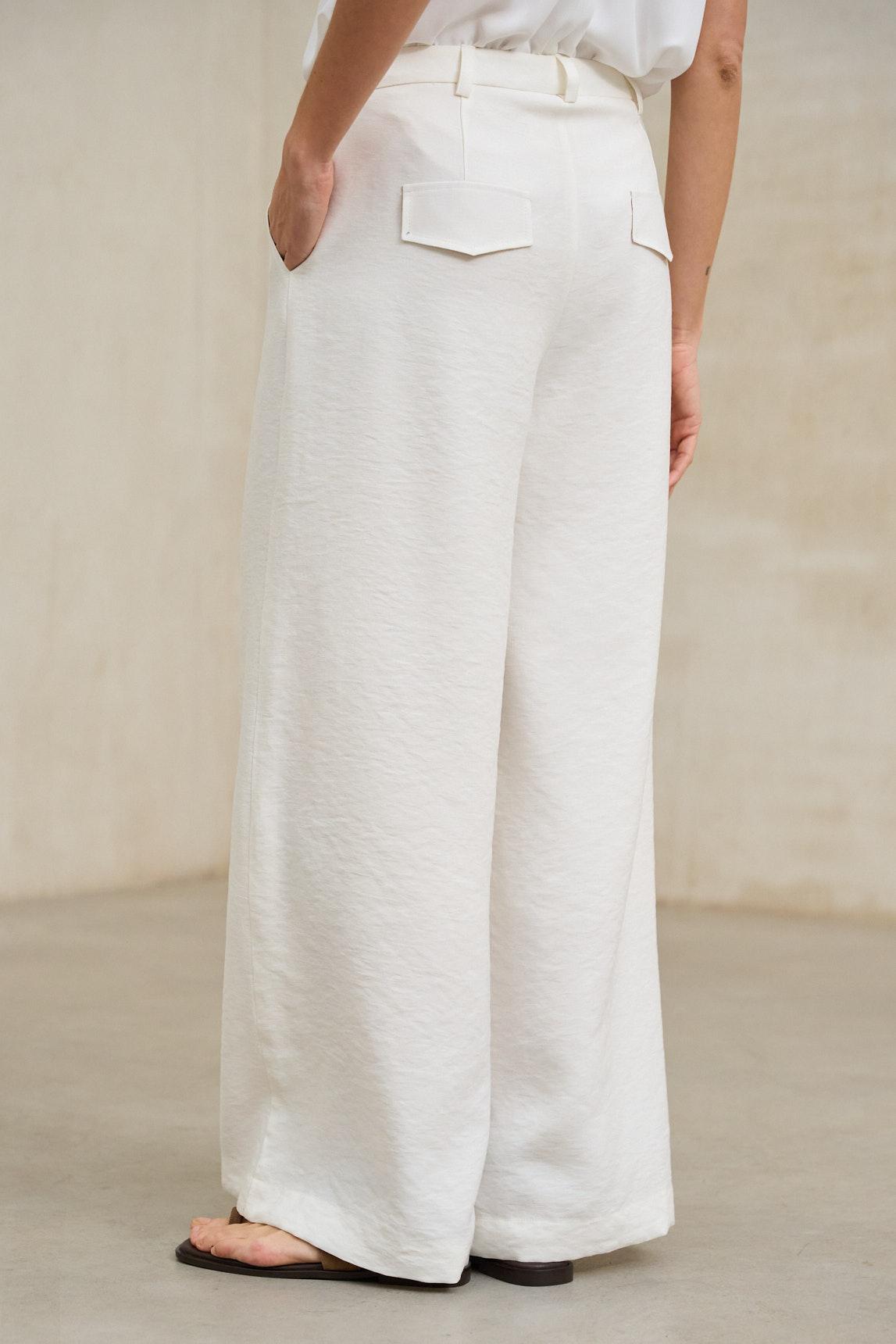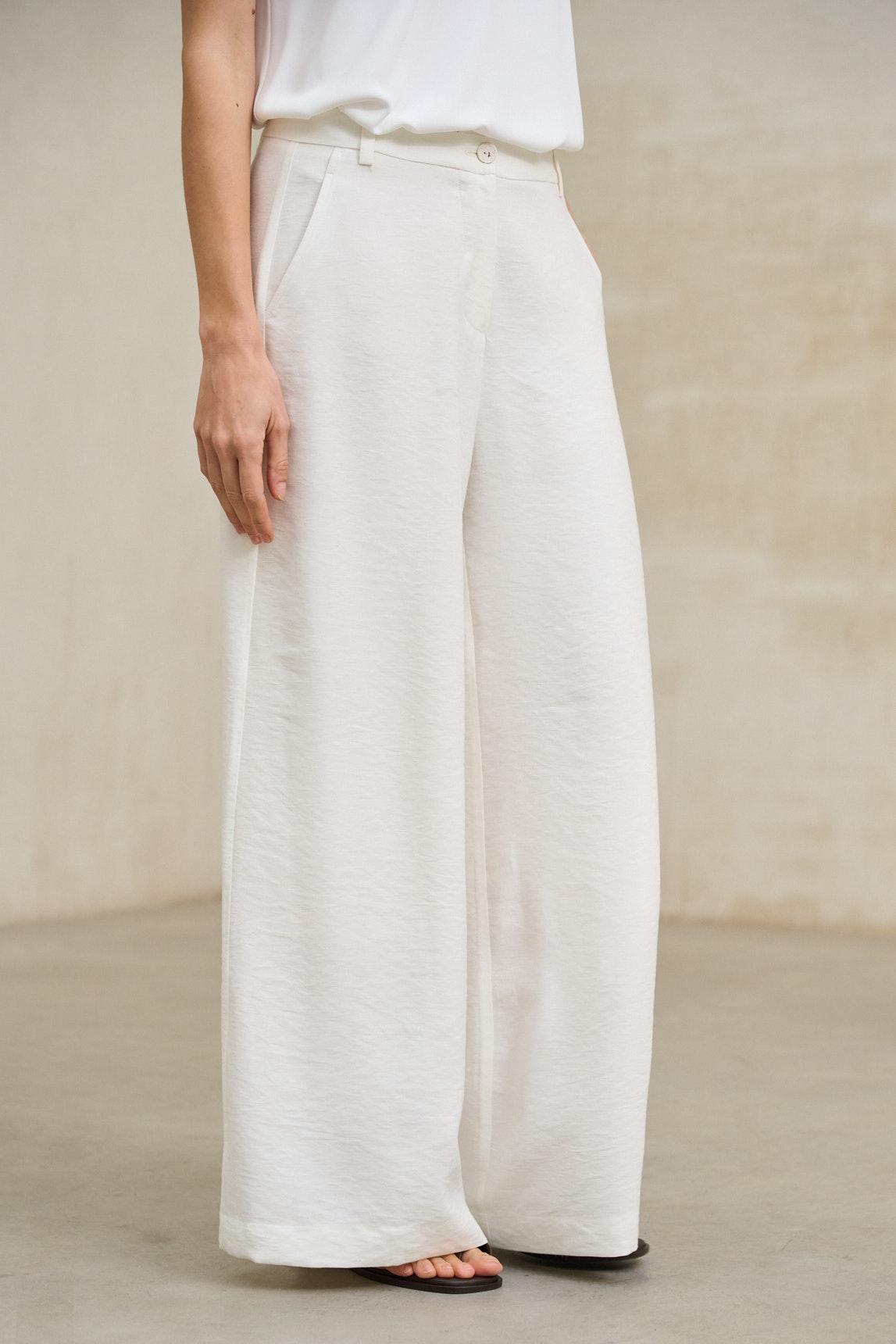 El pantalón Évren blanco roto destaca por su silueta amplia y depurada, diseñada para aportar movimiento y elegancia natural. Confeccionado en tejido fluido de tacto suave, presenta pernera ancha y caída recta que estiliza la figura sin marcar. La cinturilla limpia y estructura minimalista refuerzan su estética contemporánea, permitiendo que el volumen del pantalón sea el protagonista.