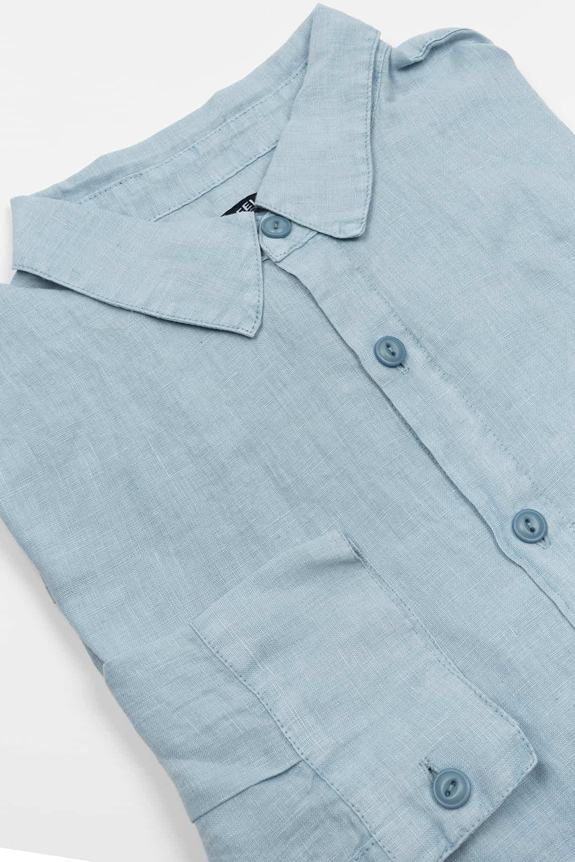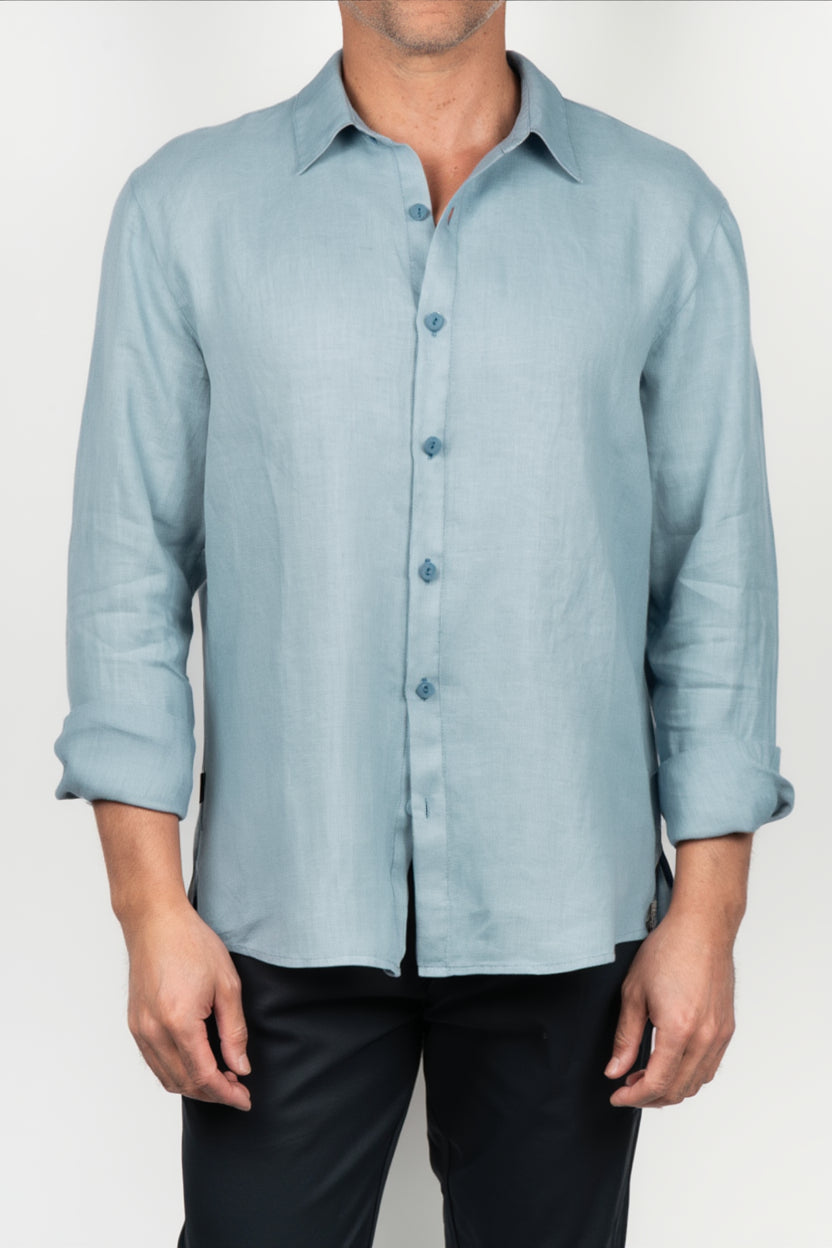 Men's long-sleeve sky blue shirt, with a plain design and a lightweight straight silhouette. It features a classic collar, front button closure, and buttoned cuffs, creating a clean and balanced look. The surface shows a subtle visual texture that adds relief to the color and reinforces its natural character, while the structure promotes a comfortable drape and a fresh feel overall.
