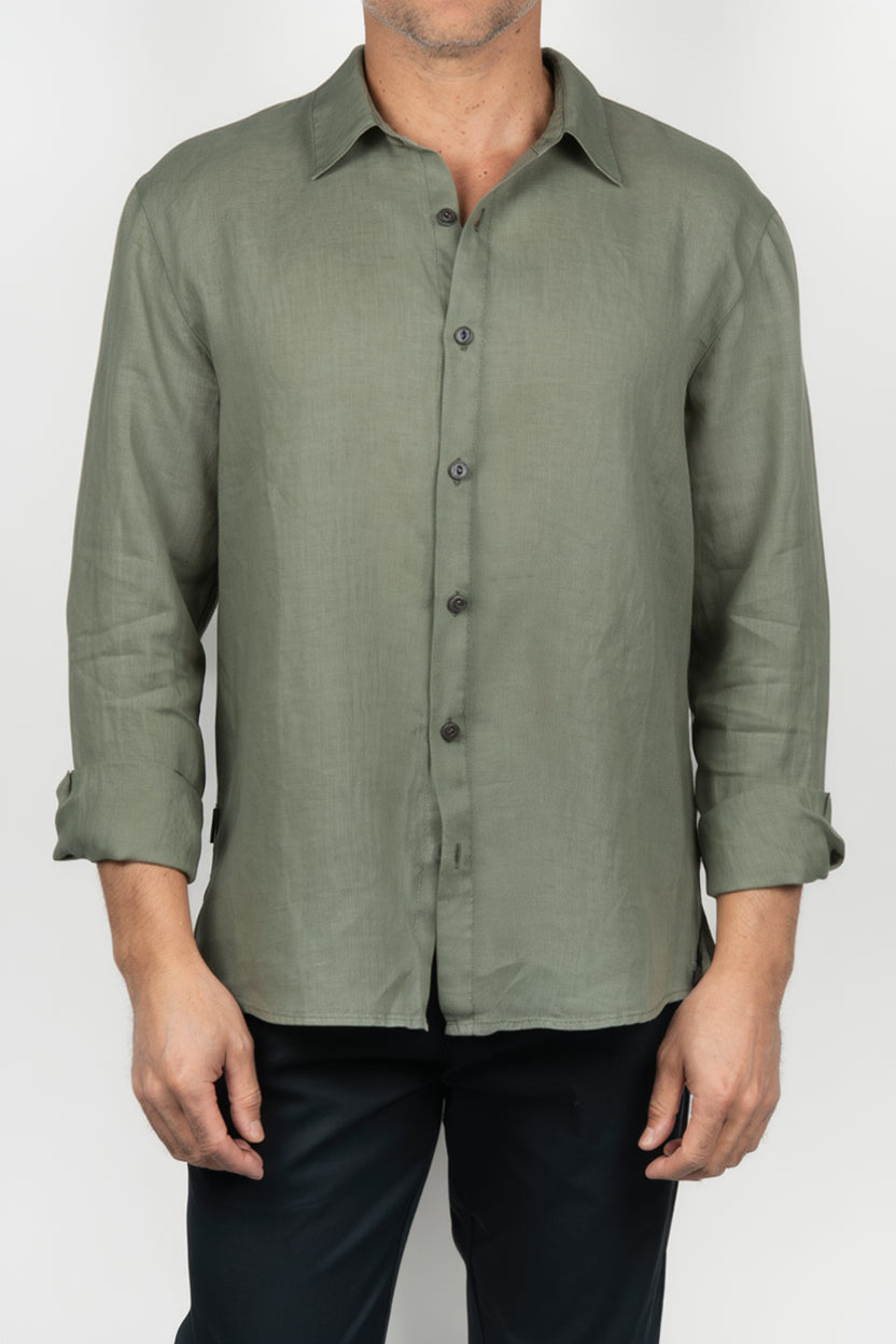 Men's long-sleeve olive green shirt, featuring a solid design and a straight, clean-lined silhouette. The model includes a classic collar, visible front button placket, and buttoned cuffs, maintaining a balanced image between functional and refined. The surface displays a subtle texture that enriches the color and gives it a natural finish, while the light drape promotes a comfortable and casual feel.