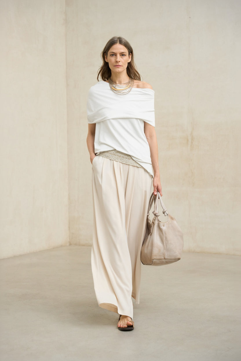 The Oryen white T-shirt stands out for its clean and contemporary design, intended to provide elegance with a minimalist approach. Its wide boat neckline is complemented by an overlapping band that crosses the top, creating an enveloping effect that adds structure and character to the garment.