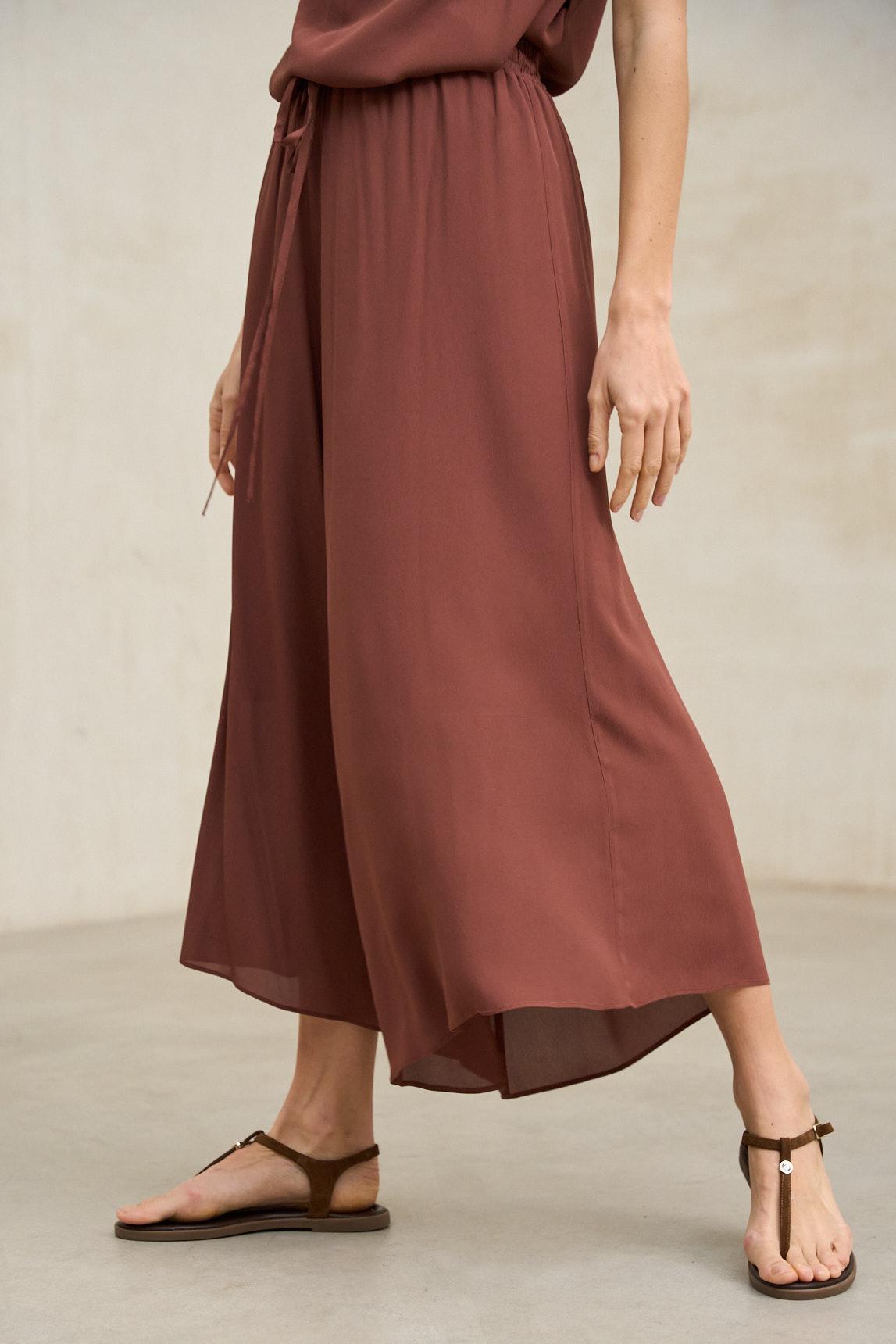 Saia comprida confecionada em tecido fluído com um caimento leve e movimento natural. Possui um cós discreto com um ajuste confortável e uma silhueta em A que se abre suavemente a partir da anca, criando um efeito elegante e favorecedor. O design destaca-se pelo movimento subtil e pelo acabamento leve, que acrescenta dinamismo ao caminhar. A saia Nareia em terracota acrescenta calor e sofisticação a qualquer look. O seu tom terra profundo é ideal para combinar com tons de branco, cru e areia, mas brilha ainda mais quando usado com a blusa Tamara, criando um conjunto coordenado, equilibrado e harmonioso. A fluidez do tecido suaviza a intensidade da cor, resultando numa peça feminina, versátil e intemporal. Perfeita para a primavera e verão, pode ser usada com sandálias rasas para um look natural ou com sapatos mais estruturados para um resultado mais sofisticado. Uma saia concebida para proporcionar movimento sem esforço, conforto e presença. Esforçamo-nos por exibir as cores da forma mais precisa possível, mas podem variar ligeiramente da realidade.
