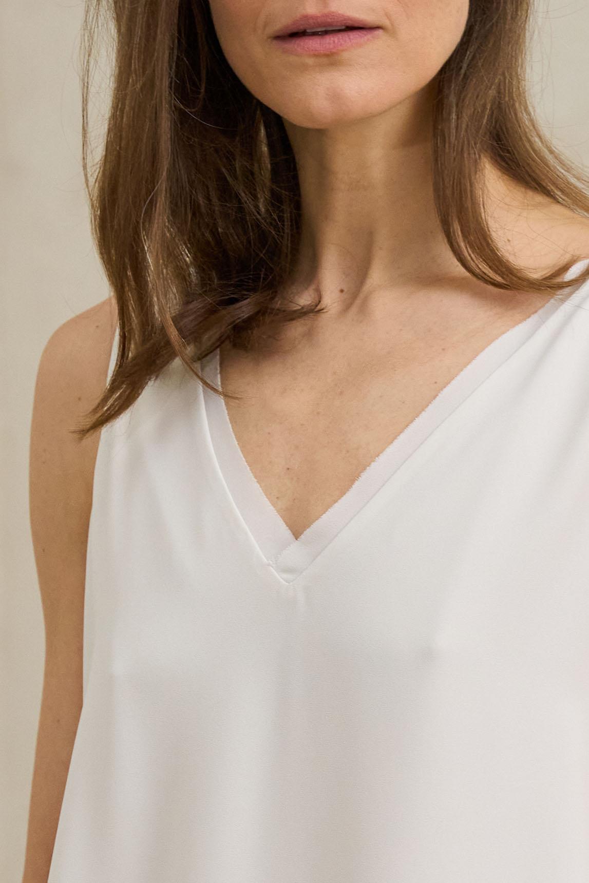 Esta blusa sem mangas apresenta uma silhueta leve e fluida, definida por um decote em V na frente e nas costas que realça a parte superior do corpo. O tecido tem um caimento suave e contínuo, com um acabamento liso que realça a sensação de fluidez. A bainha ligeiramente arredondada acrescenta movimento e reforça a sua estética descontraída, enquanto o corte solto permite que a peça acompanhe os movimentos do corpo sem marcar. Em termos de estilo, é uma peça essencial com uma abordagem minimalista e versátil. O seu corte descontraído facilita a combinação com calças de corte direito, saias ou peças mais estruturadas, criando equilíbrio visual. A cor branca acrescenta calor e um toque natural, ideal para looks neutros ou combinações com tons terra e suaves. Concebida para o dia a dia ou para looks mais sofisticados, esta blusa emana leveza e simplicidade requintada. Integra-se facilmente em diversos estilos, acrescentando luminosidade e uma sensação de frescura intemporal. Esforçamo-nos por exibir as cores da forma mais precisa possível, mas podem variar ligeiramente da realidade.