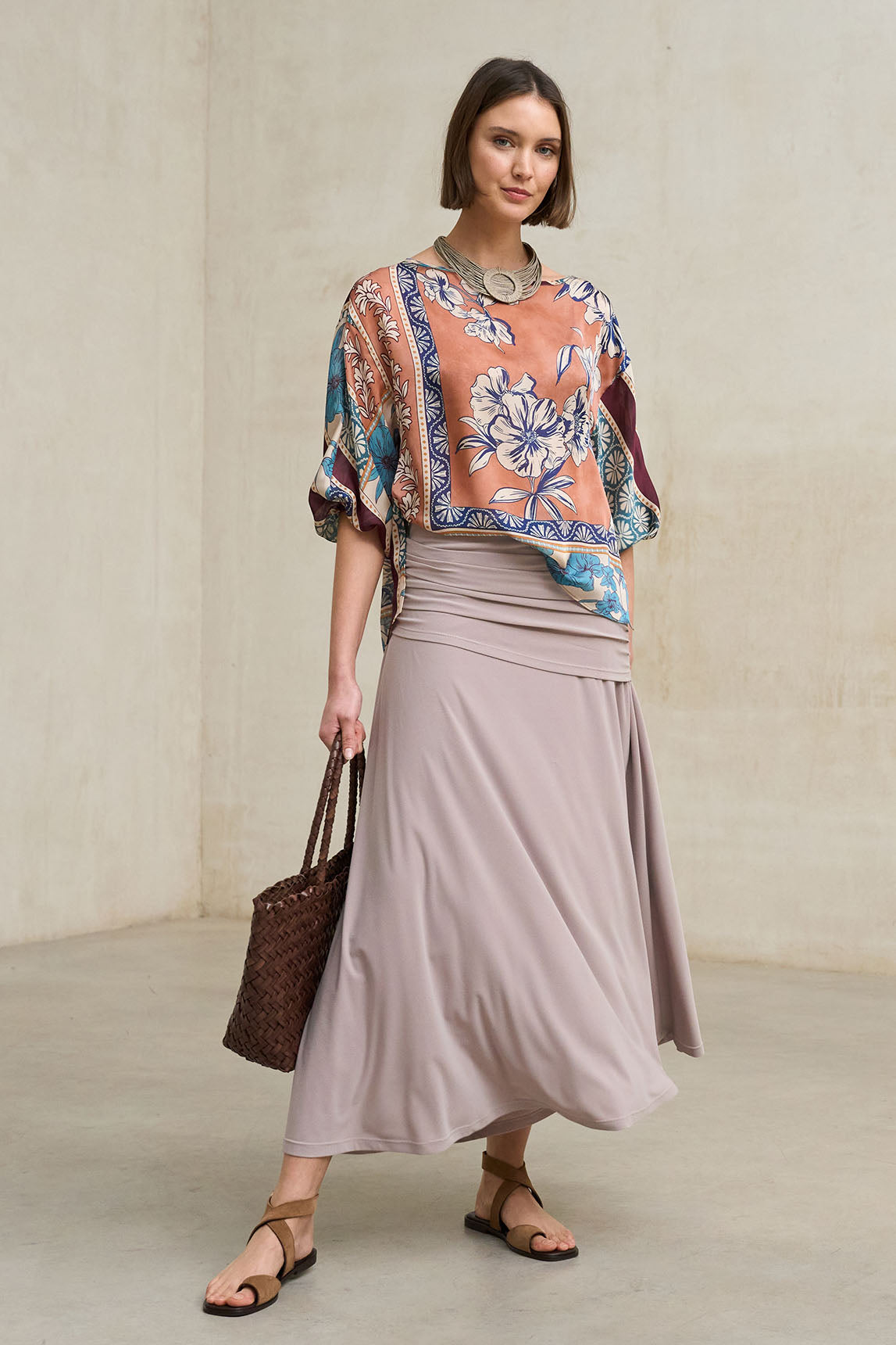 A blusa estampada Avenia combina um design fluido com um padrão artístico em tons terracota, verde-azulado e neutros, criando uma peça marcante e fácil de incorporar em qualquer guarda-roupa. O seu estampado complementa a saia a condizer, permitindo criar um look coordenado com efeito de vestido.