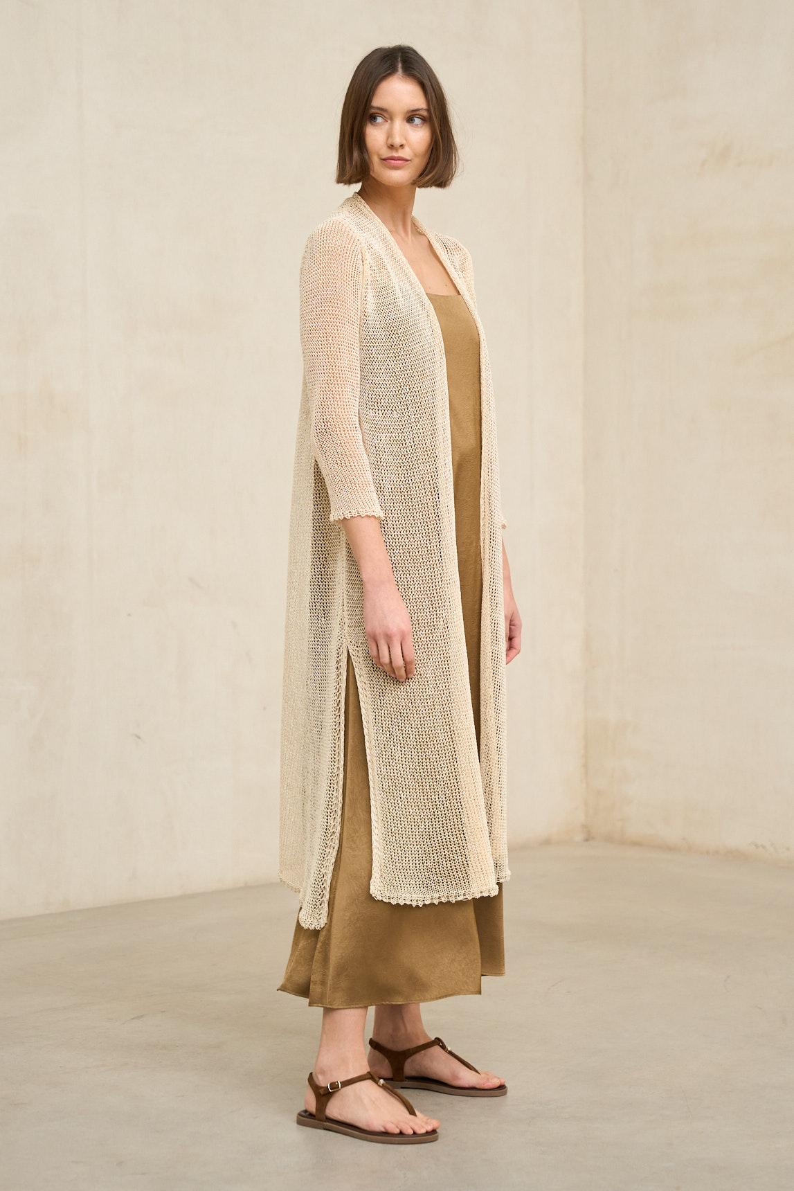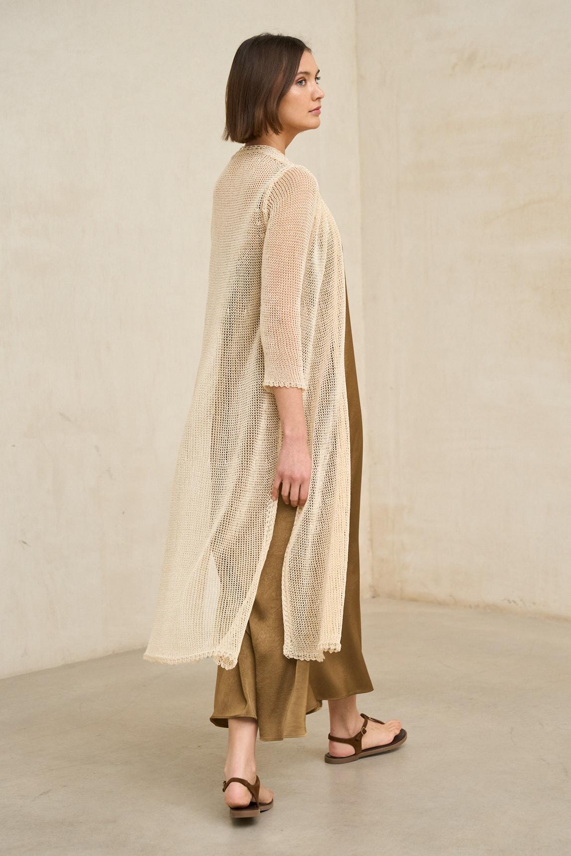 La levita de punto Avenel beige es una pieza ligera y envolvente confeccionada en tejido de punto fino calado, con una textura abierta que aporta profundidad y un movimiento delicado al conjunto. Su diseño largo y abierto estiliza la silueta, creando una línea vertical elegante y fluida. El tejido de punto presenta un efecto ligeramente translúcido que permite jugar con las capas y aportar dimensión al look.