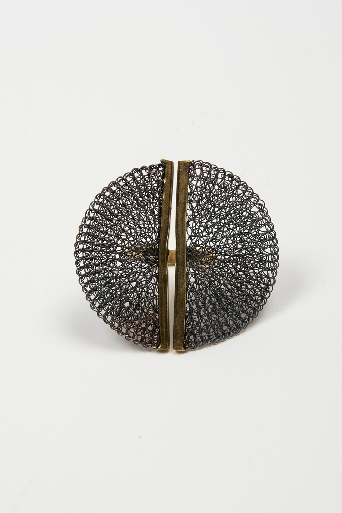 - Anillo circular elaborado en malla metálica artesanal con doble barra central dorada.