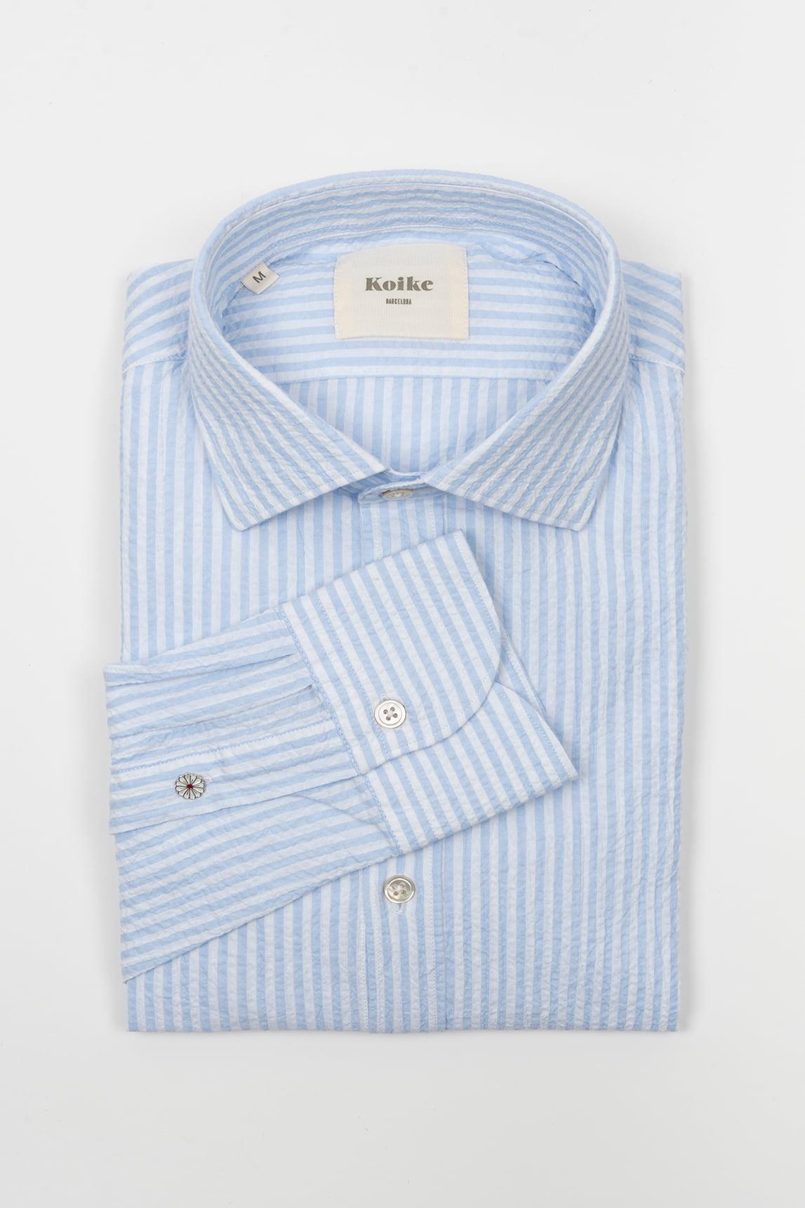 A camisa Koike Hikari azul-clara com riscas finas combina a elegância clássica e a frescura contemporânea num design intemporal. Confecionada em algodão leve e suave ao toque, apresenta um delicado padrão de riscas verticais em azul-claro sobre um fundo branco que alonga visualmente a silhueta.