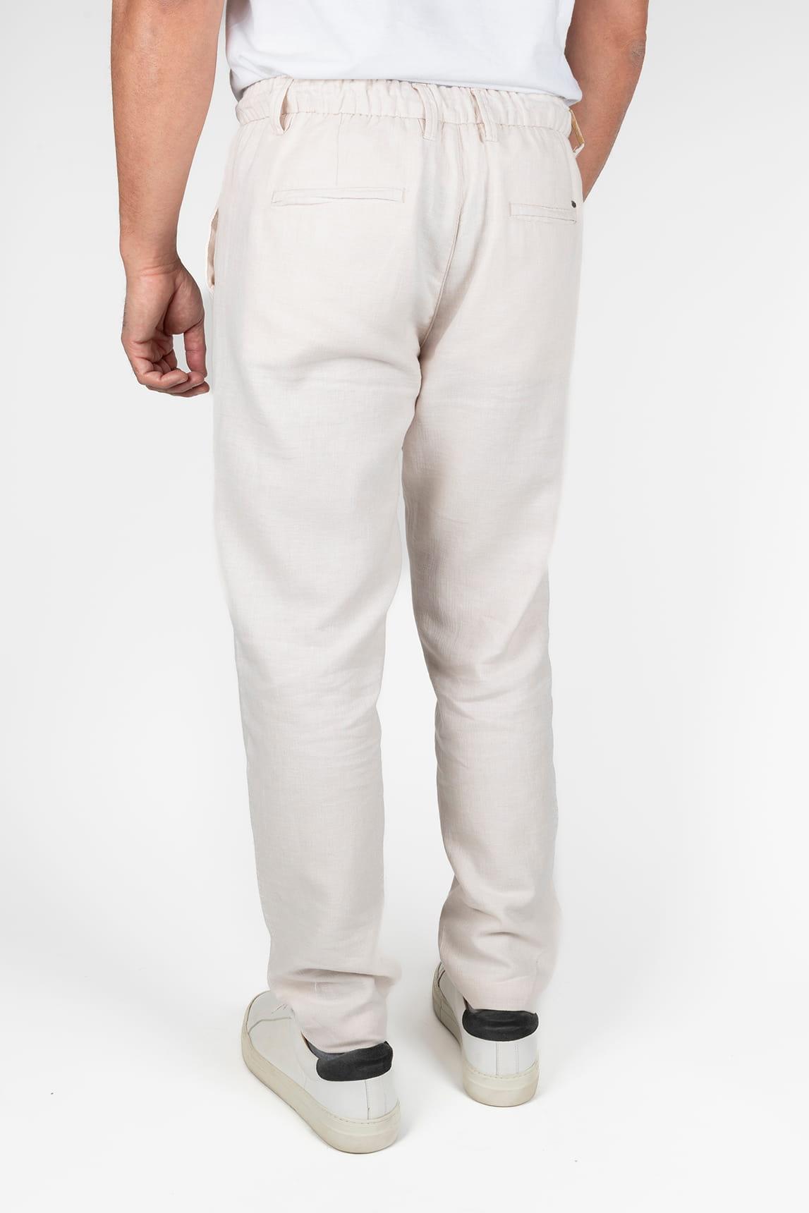 Este pantalón en tono blanco roto presenta una silueta relajada con pernera larga y una caída natural que aporta ligereza al conjunto. La cintura combina trabillas con cordón ajustable visible, integrando funcionalidad y estilo en un mismo gesto, mientras el frente limpio y los bolsillos laterales mantienen una estética equilibrada. El tejido de apariencia texturizada, con un sutil efecto jaspeado, añade profundidad visual y un carácter distintivo.