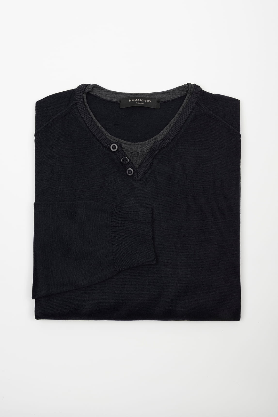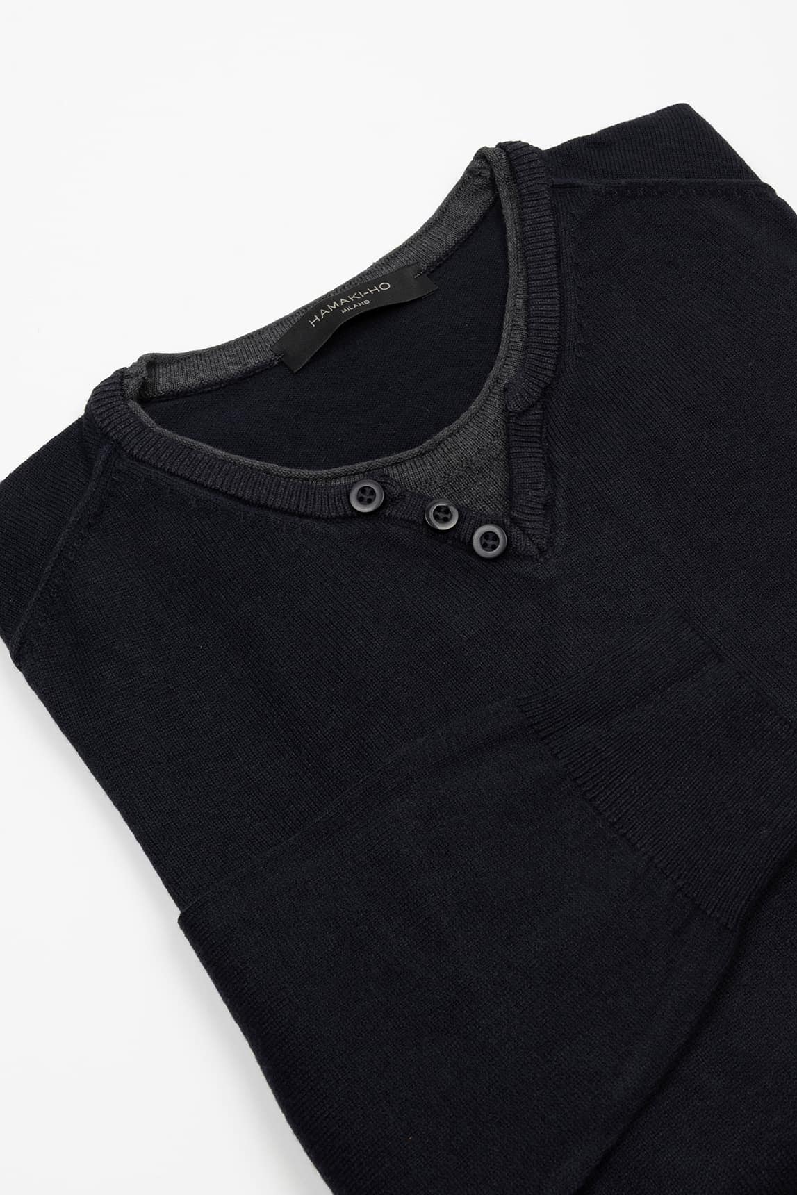 El jersey azul marino de Hamaki-ho es una prenda esencial en el armario masculino. Su cuello en pico con botones aporta un toque moderno sin perder la elegancia clásica del punto fino. Perfecto para el día a día o para un look más cuidado, destaca por su confort, versatilidad y acabado impecable, característico de la firma italiana.